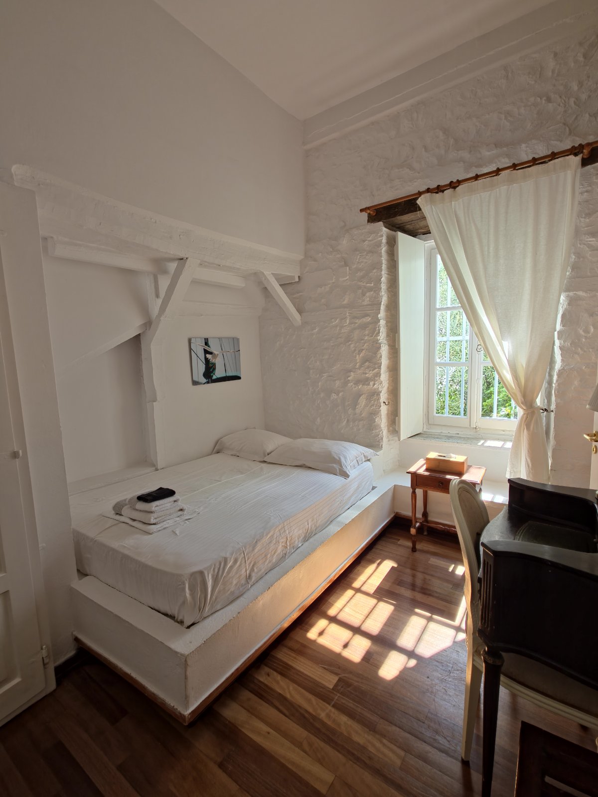This bright 14 sq. m. room is perfect for solo travelers, offering a peaceful view of a lush, green garden. With its high ceilings, wooden floors, and traditional island-style furnishings, it creates a cozy and inviting atmosphere for a relaxing stay.