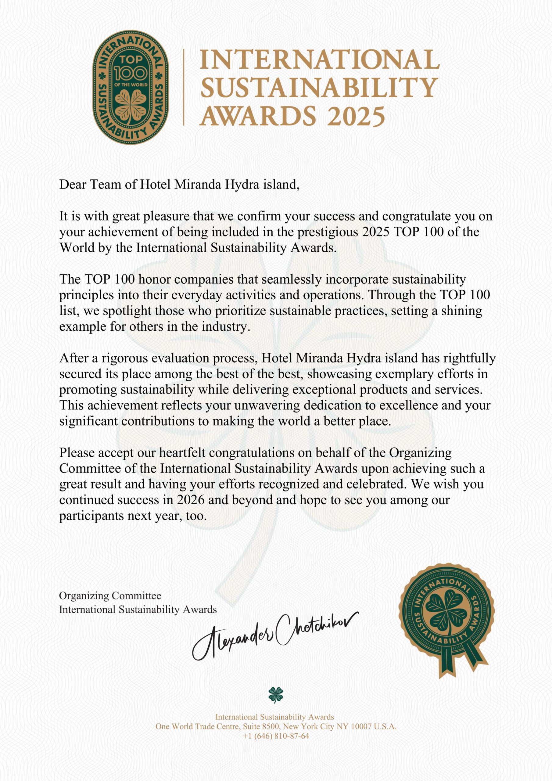The work and the contribution of Miranda Sofianou has been recognized the high quality of the cultural, artistic, musical and literary events that took place and are still taking place in the superb rooms of the hotel, have made their mark and left sweet memories.